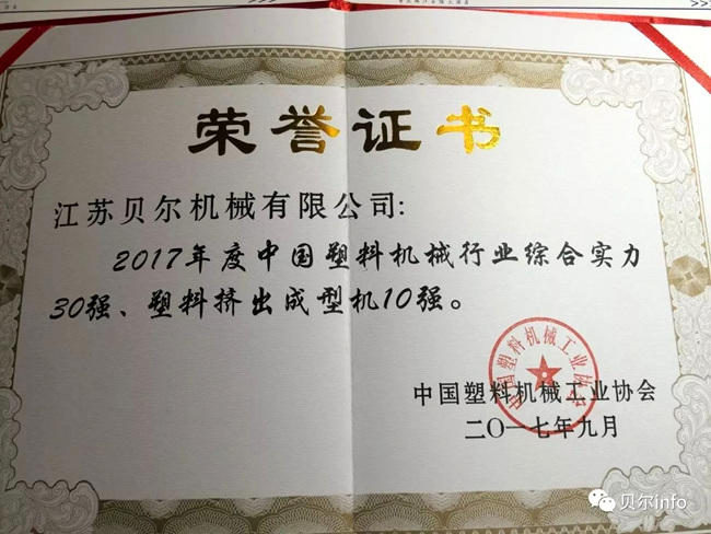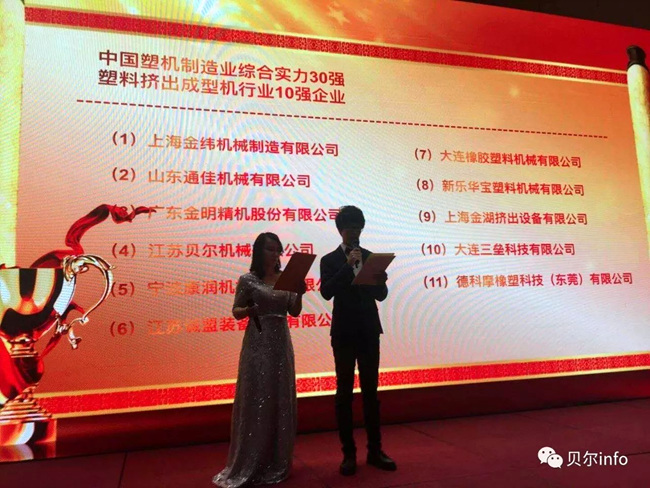 江蘇貝爾機(jī)械作為中國塑料機(jī)械工業(yè)協(xié)會(huì)副會(huì)長單位受邀參加此次論壇。論壇中,江蘇貝爾機(jī)械榮獲"2017年度中國塑料機(jī)械行業(yè)綜合實(shí)力30強(qiáng)、塑料擠出成型機(jī)10強(qiáng)"稱號(hào)。