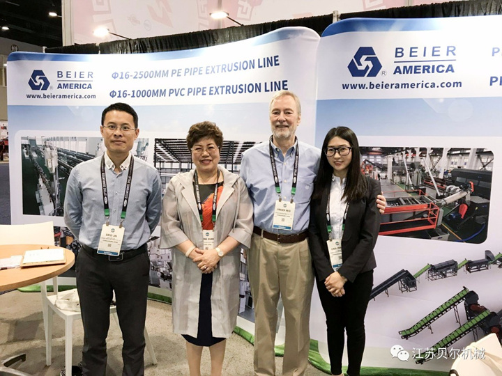 挑戰(zhàn)與機遇并存,面對市場潛力巨大的美國市場,江蘇貝爾機械憑借產(chǎn)品智能、環(huán)保、節(jié)能的優(yōu)異性能、高性價比的優(yōu)勢以及完善的服務在美國客戶中有著良好的口碑。因此,我們相信盡管貿(mào)易政策會給出口美國帶來影響,但對高質(zhì)量設備的剛需是不變的。所以,貝爾機械派出了非常熟悉美國市場的銷售精英參展,為北美客戶展示公司這三年來的的研發(fā)成果和高新設備。其中, 回收類的產(chǎn)品受到中國環(huán)保新政的影響,很多美國廠商都來到展位進行洽談和了解,探討在美國本土處理塑料固廢的生產(chǎn)方案。