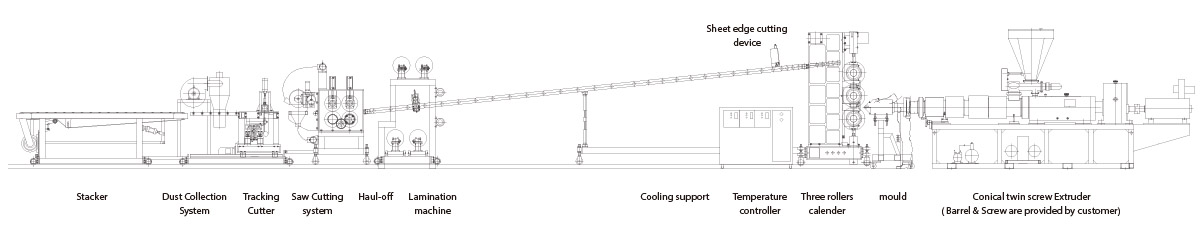 成型輥筒回路冷卻系統(tǒng),配合模溫控制機(jī)精確控制壓棍輪溫度,使板材厚薄均勻。